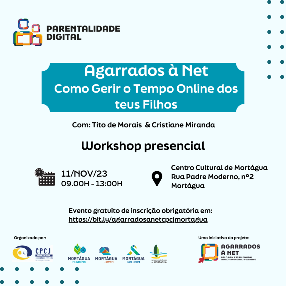 Sábado, dia 11, vamos estar em Mortágua com o nosso workshop "Agarrados à Net - Como Gerir o Tempo Online dos Teus Filhos".