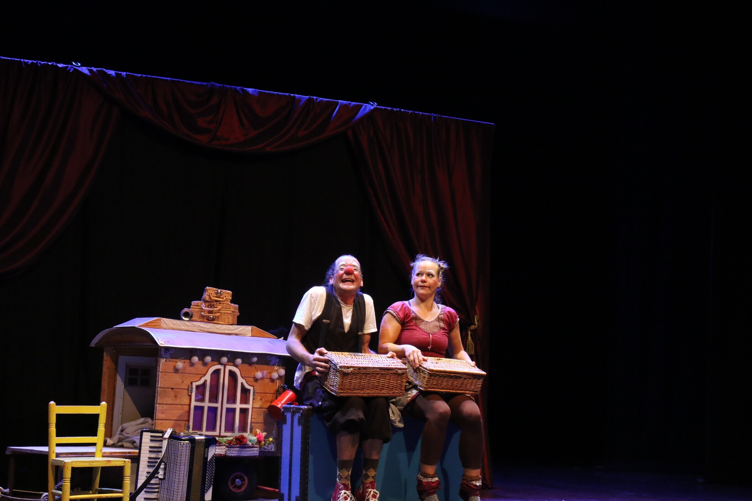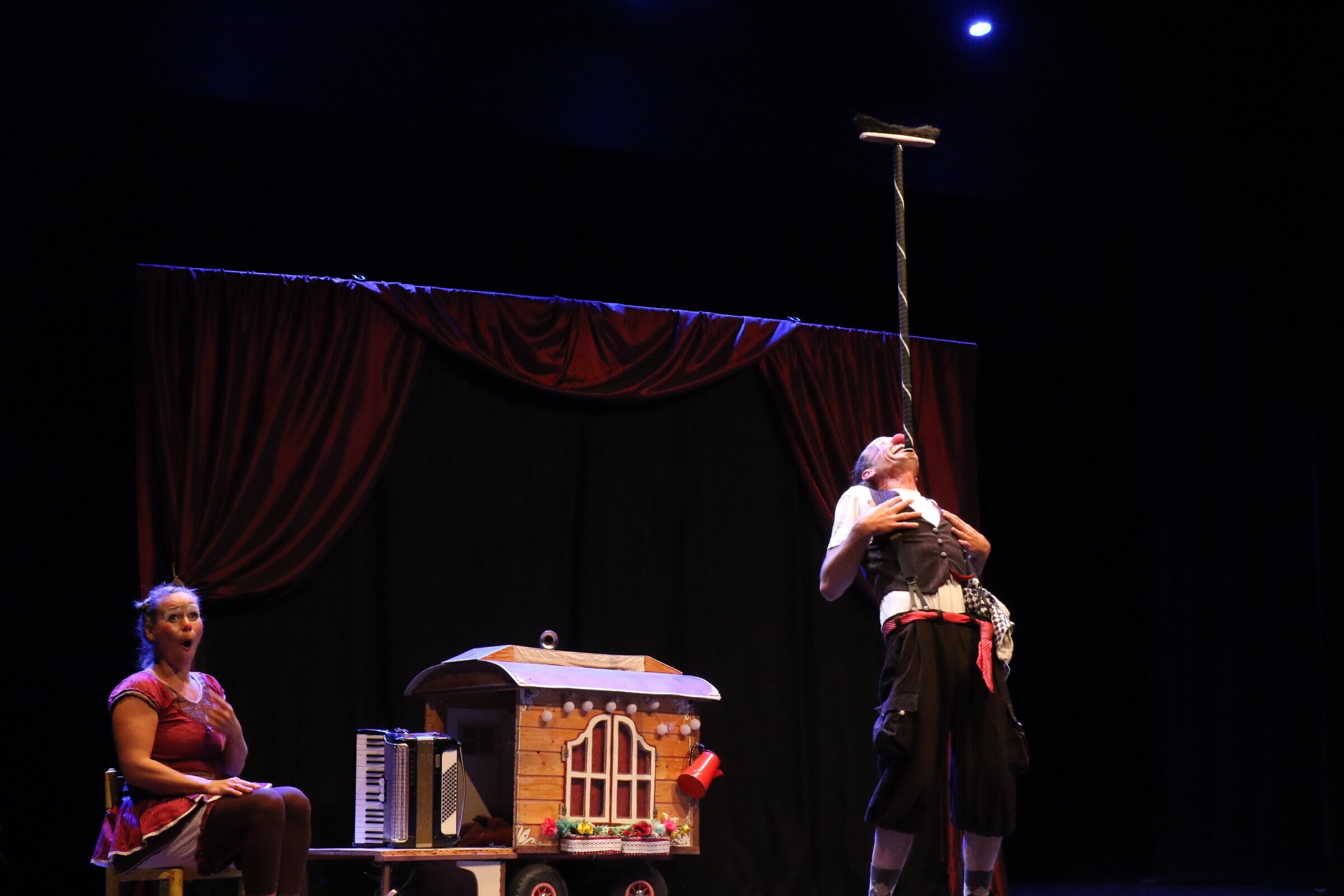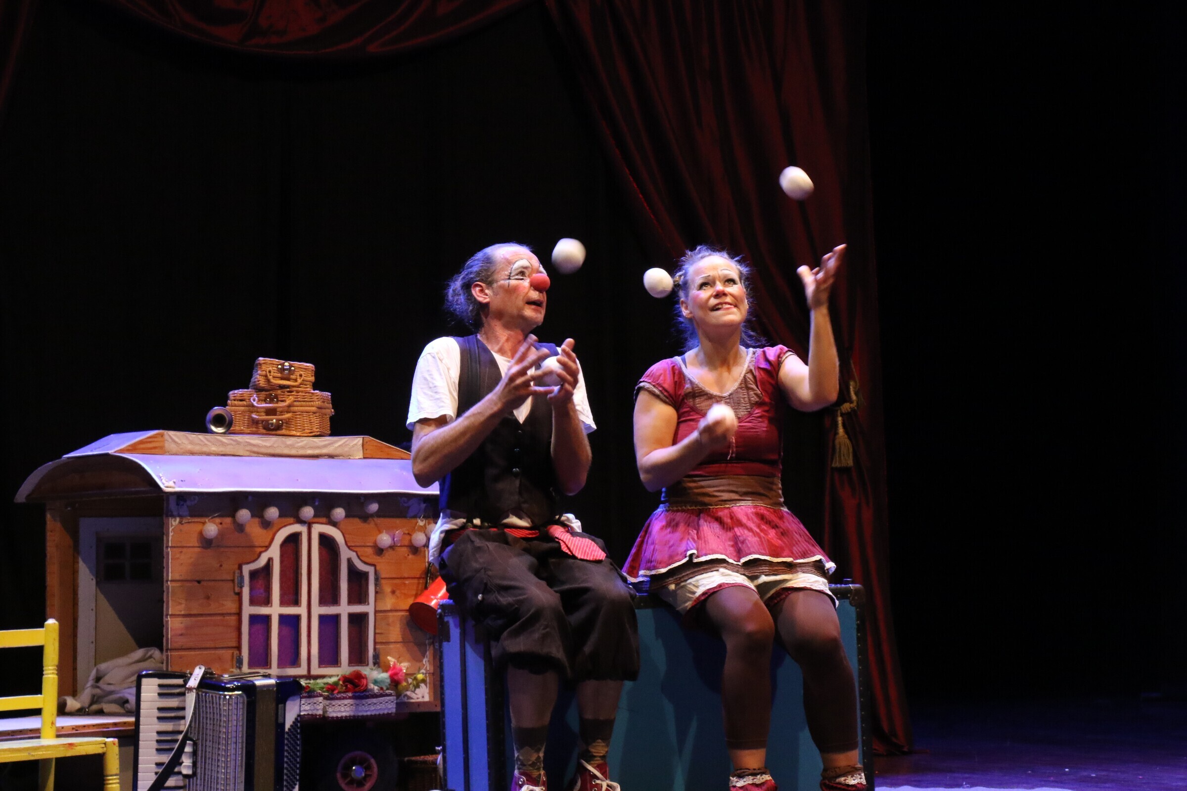 Angèle Guerin e Marianus Neyrink formam esta simpática e divertida dupla de palhaços/malabaristas, de origem alemã, que faz rir sem palavras, apenas utilizando a expressividade, os sons, a mímica. A dupla cativou com as suas habilidades artísticas que desafiam as leis da gravidade e encantou toda a plateia, miúdos e graúdos. Os dois filhos do casal, de 7 e 10 anos, também subiram ao palco, no final, e mostraram que já respiram as artes performativas.